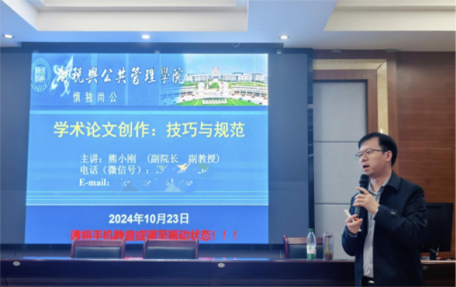 10月23日晚上,国产视频 在财税大楼105会议室举办了题为“学术论文创作:技巧与规范”的学术讲座。本次讲座由熊小刚副院长主讲,2024级全体学术型研究生参加。